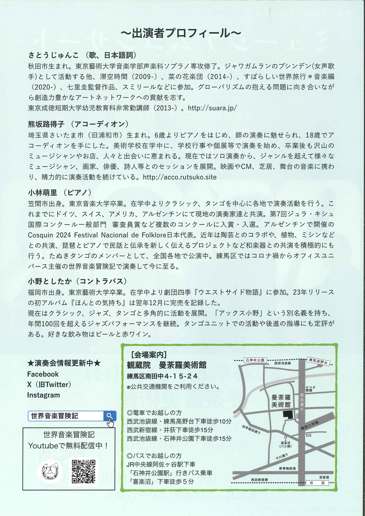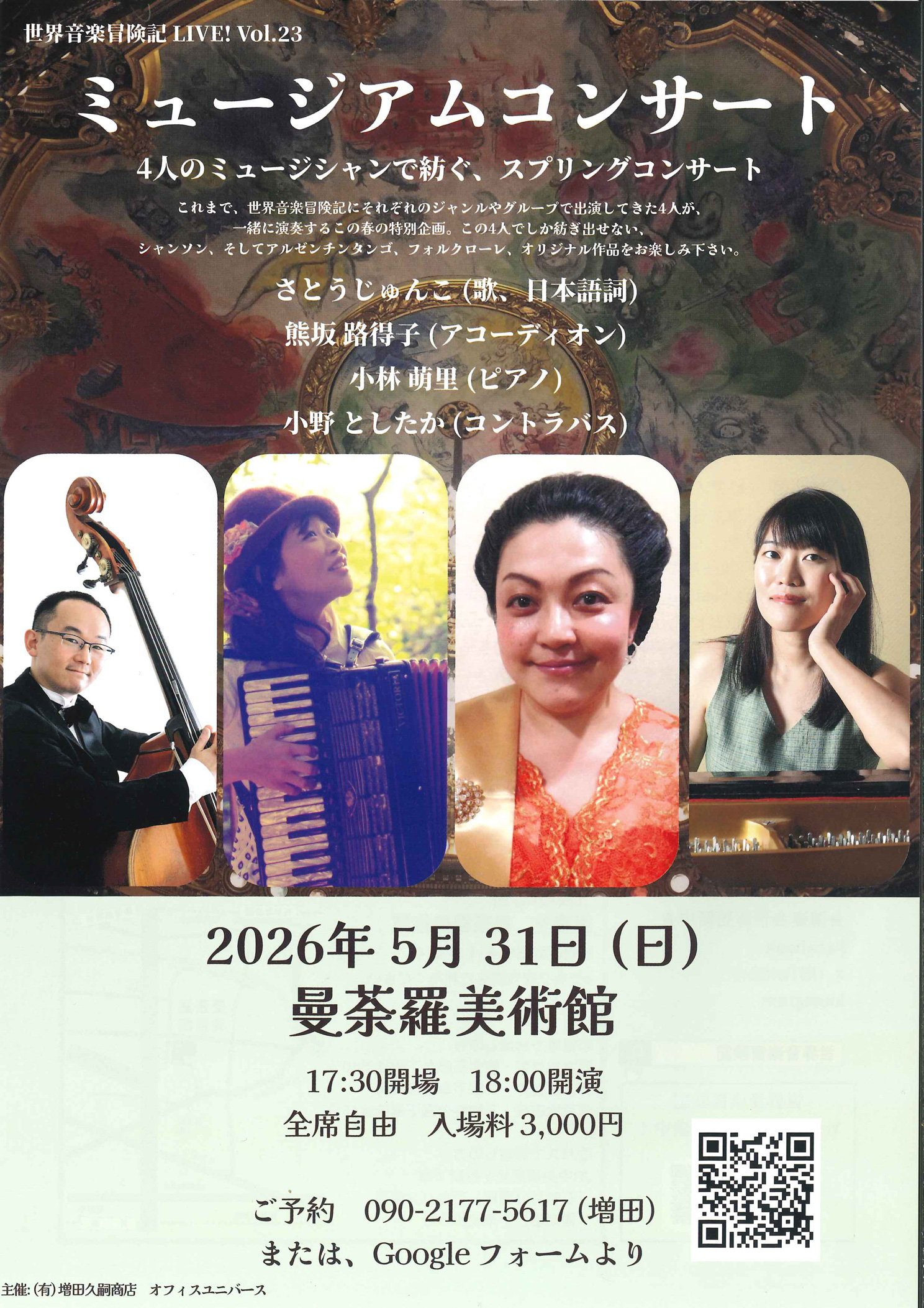 出 演:さとうじゅんこ(歌、日本語詞)・熊坂路得子(アコーディオン)・小林萌里(ピアノ)・小野としたか(コントラバス)